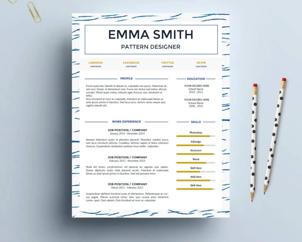 Notice that the colors are not crazy or overwhelming. They instead accentuate the applicant’s skills. This designer also uses a pattern on her resume which matches the job position. But this is the rare exception – for the non-creative professionals, it’s better to stick to black and white (and avoid busy patterns!).