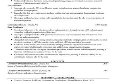 The last portion of your resume should display your education, sales certificates, trainings, awards, and highlight your relevant technical skills.