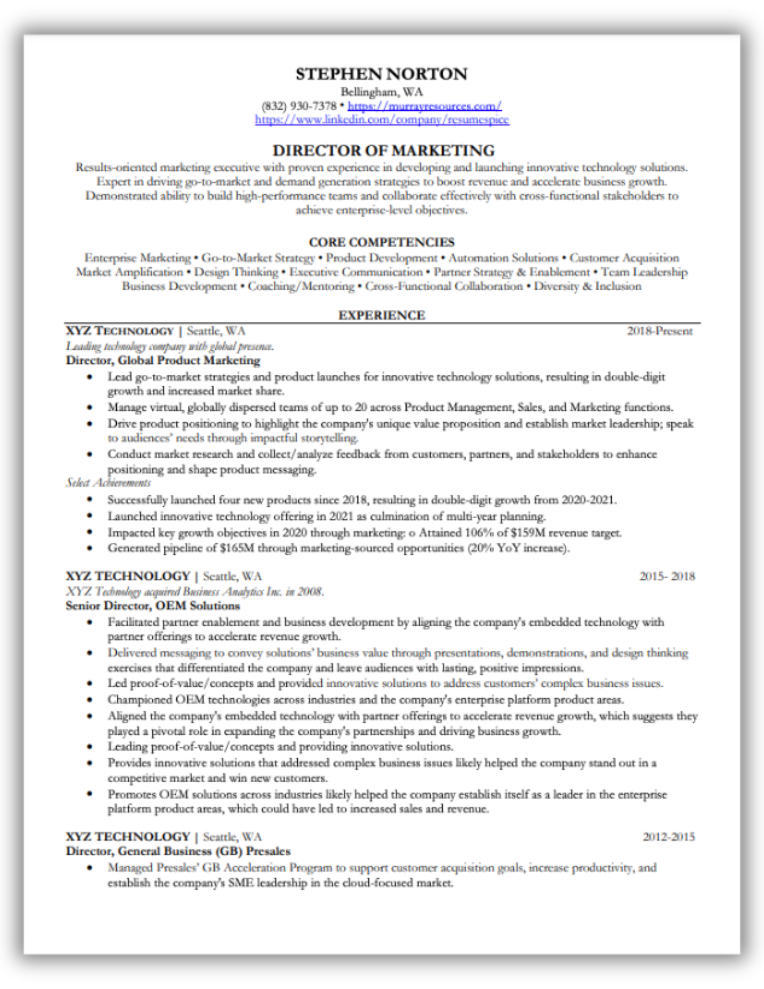 - Include the following sections: contact information, branding statement, core competencies & experience, education, certifications, and technical skills in reverse chronological order