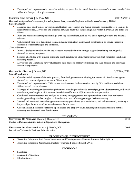 The last portion of your resume should display your education, sales certificates, trainings, awards, and highlight your relevant technical skills.